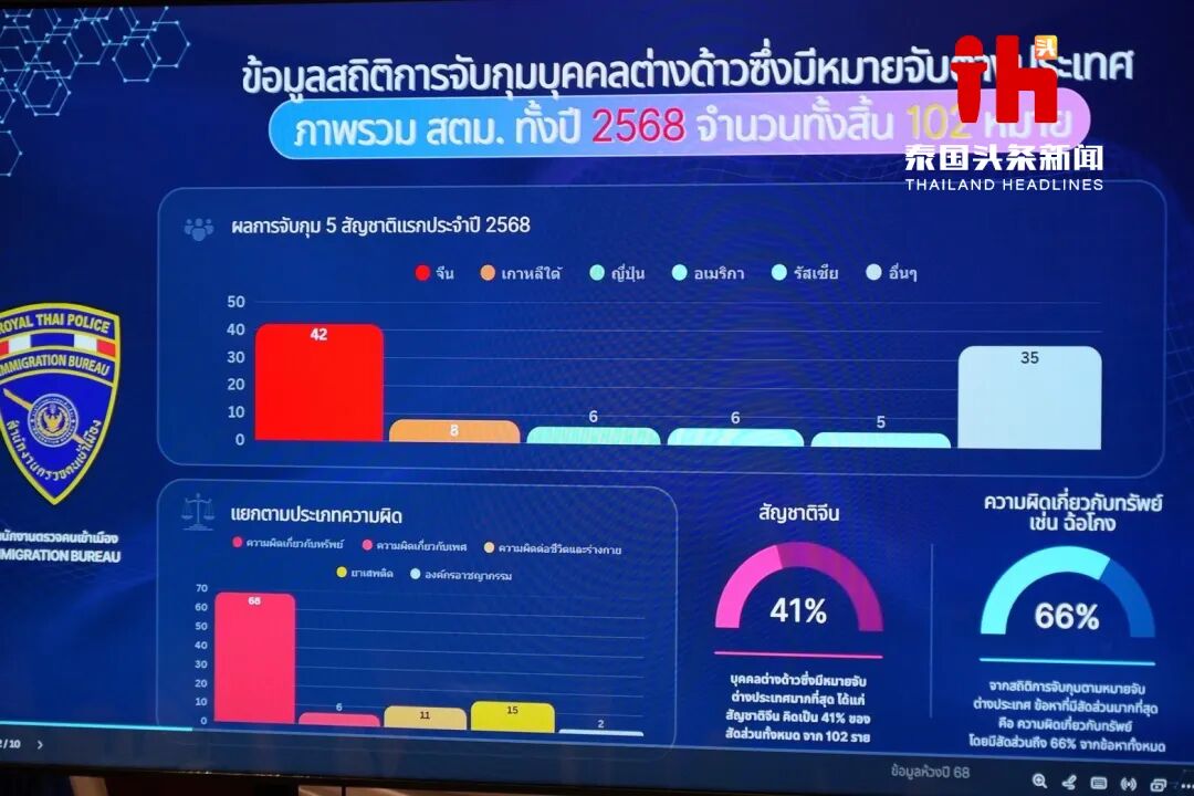 在移民局局长、移民局冲击犯罪行动中心主任帕努玛警中将的同一批示下,副局长潘塔纳警少将以及多名高级警官配合召开消息公布会,传递了严重案件侦办情况以下: 一、移民局抓捕被本国通缉的外籍职员统计情况 移民局公布了2025年及2026年抓捕被本国通缉的外籍职员的统计数据。 2025年:共抓捕102人。 按国籍分别:中国籍42人、韩国籍8人、日原籍6人、美国籍6人、俄罗斯籍5人,其他国家共35人。 按犯罪范例分别:财富类犯罪68人、性犯罪6人、风险生命与人身平安犯罪11人、毒品犯罪15人、有构造犯罪2人。 2026年:共抓捕23人。 按国籍分别:美国籍1人、俄罗斯籍1人、中国籍14人、越南籍3人、台湾籍1人、马尔代夫籍1人、法国籍1人、韩国籍1人。 按犯罪范例分别:财富类犯罪13人、性犯罪1人、风险生命与人身平安犯罪4人、有构造犯罪3人、毒品犯罪1人、洗钱犯罪1人。