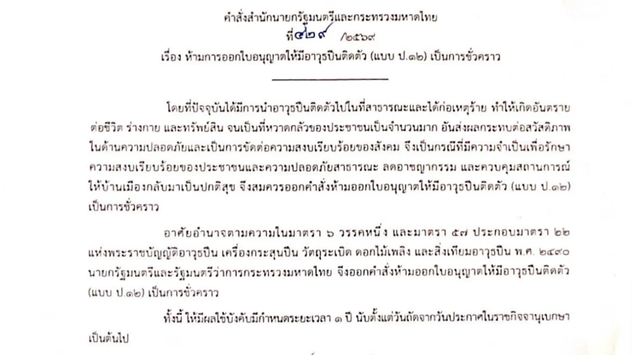 该号令指出,近期社会上延续发生将枪枝带入公共场所实施犯罪的事务,对公众生命与财富平安形成严重威胁,并激发普遍社会发急。为保护社会次序、下降犯罪发生率,总理兼内政部长根据《枪枝法 B.E.2496》赋予的法定权利,果断出台此项姑且管控办法。 按照号令,停息签发工具为小我随身照顾枪枝答应证,即表格P.12,适用于全国范围,刻日为整整1年。该办法旨在最大限度削减公共场所涉枪犯罪风险,回应公众对平安的迫切诉求。 此次号令的签订与公布,标志着泰国政府在公共平安治理方面迈出重要一步,也为后续能够推出的长效枪枝管控机制奠基根本。 (编译:WAN;来历:thairath) 原文地址:https://www.thaiheadlines.com/184992/ |